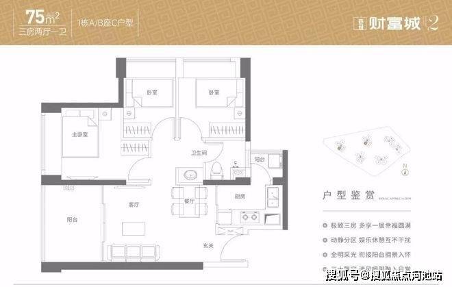 75㎡的3房2厅1卫,设计的是竖厅格局,客厅3.35米开间,3个卧室分别是3.1/2.85/2.25米的宽度,L型厨房,带1个小生活阳台,卫生间三段式分离设计,得房率:91.52%(包含赠送),西南及西北朝向。