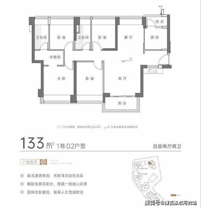133㎡四房两厅二卫:该户型也是南北通透双阳台设计,只有一条腿,西南向。说实话这种南北通户型设计还是很加分的,就是这个朝向会有视野遮挡,低楼层看小区园林不错,高楼层反而会楼看楼。