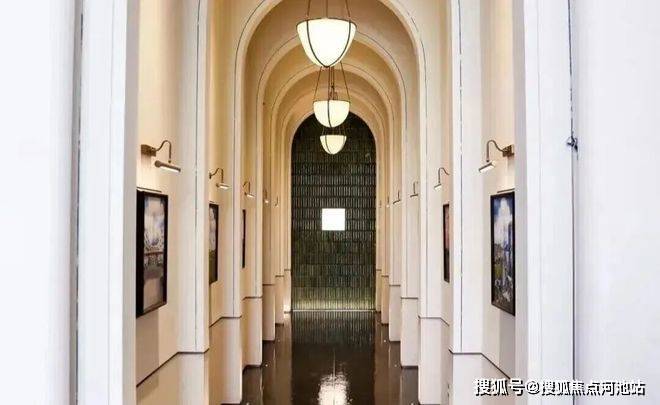 主入口外场是酒店式落客区围合空间,中间是开敞大气的跃升式入口,两侧运用维纳多石材铺贴,公区整体质感突出。