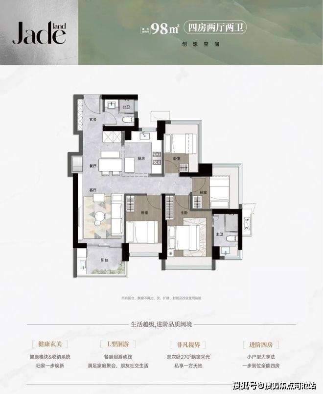 114平㎡的4房2厅2卫,设计的是横厅南北通透格局,进门入户玄关,LDKB一体化,五开间朝南,全屋9面飘窗,主卧大套间,U型厨房,卫生间干湿式分离,得房率约92%(包含赠送),阳台主朝东南向。