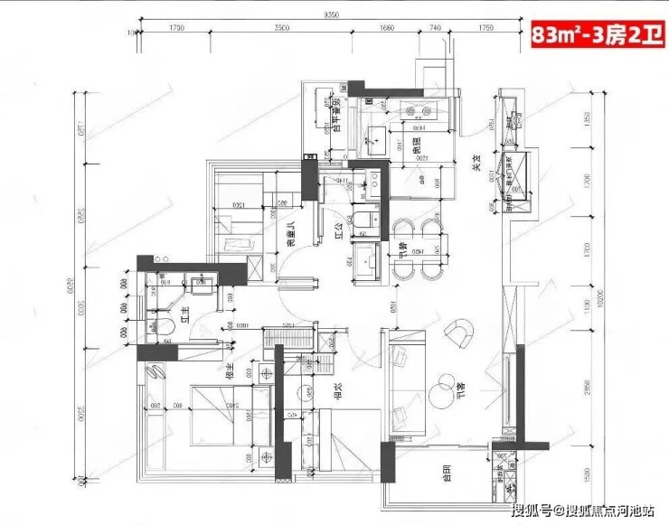 83㎡的3房2厅2卫,设计的是经典竖厅格局,客厅3.35米开间,LDKB一体化,S墙设计预留双开门冰箱卡槽位,三开间朝南,动静分区,U型厨房,公卫三段式干湿分离,赠送1.98平设备平台,得房率约77.15%(不含赠送),阳台5.02m²西南或东南朝向。靓点:83平做到了3房2卫,主卧270°无柱转角飘窗,厨房烟道外置+额外赠送设备平台,并且是纯南向格局。