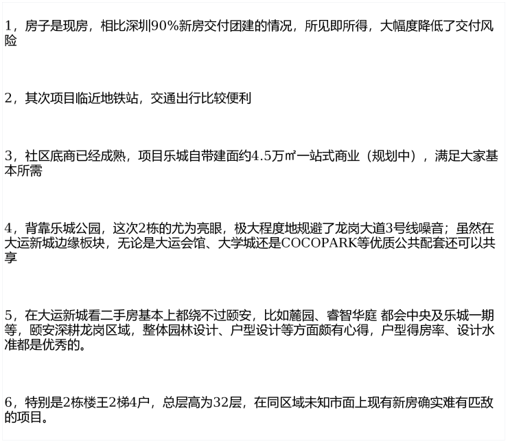 颐安乐城,总共分5期开发,大运是深圳的六大城市会客厅之一,是整个东部的中心,大运中心市政配套、交通便利、教育配套、商业设施在整个东部来说是最好,项目靠近大运体育馆,承接了深圳60%的赛事,包括世界杯预选赛,各大明星演唱会都选择在这里,有世界级的恒温游泳池,篮球馆,羽毛球馆等公共设施,包括华润万象天地商业。