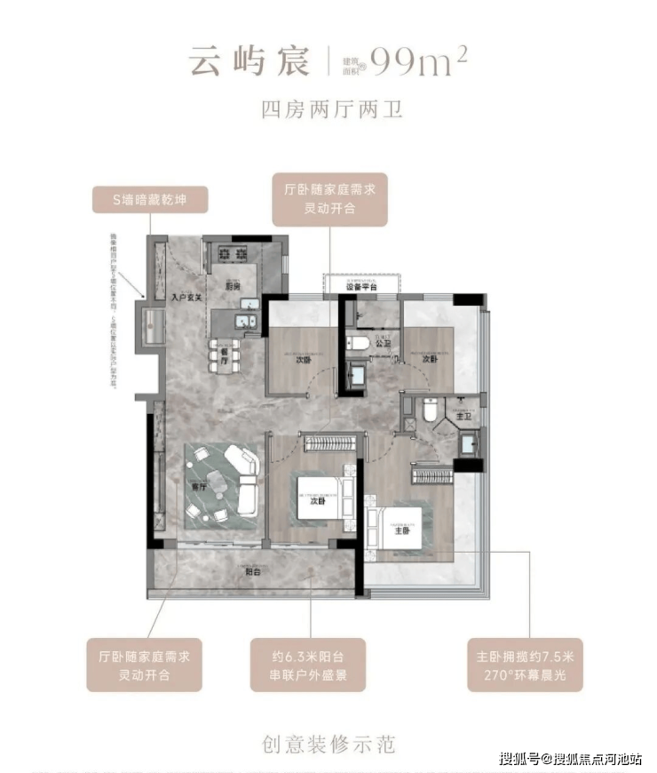 ✅ 99㎡4房2卫为项目主力户型,折后总价362-388万/套,单价3.63-3.89万/㎡,竖厅格局,LDKB一体化,三开间朝南,客厅连接次卧出9.37㎡大阳台,赠送设备平台,房源充足;