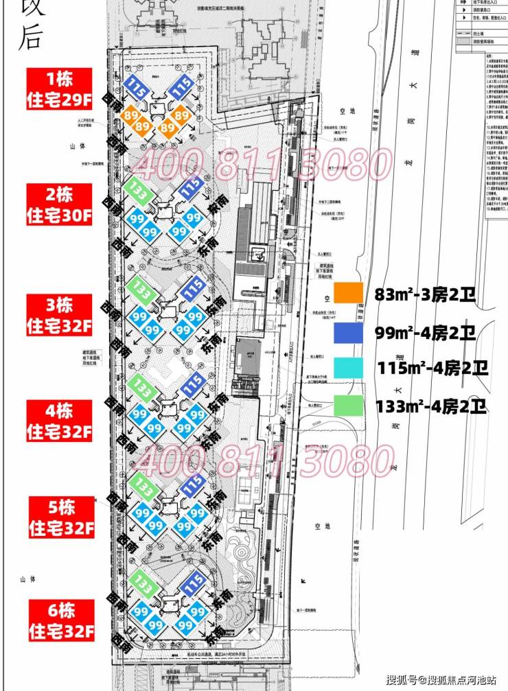 ✅ 共6栋29-32层非超高层住宅,总规划1086户。梯户比3梯6户,户户朝南,配备3层地下室、1116个车位,车位比1:1.02。