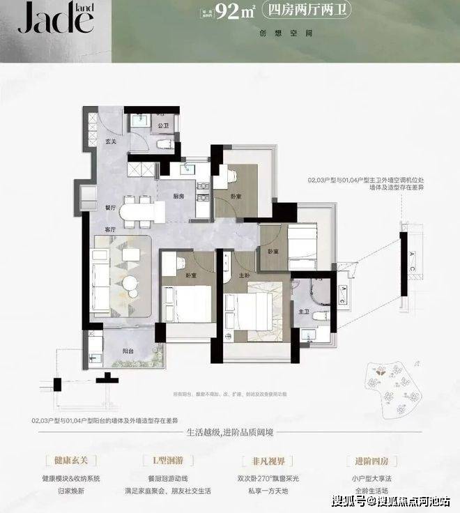 92㎡的4房2厅2卫,设计的是经典竖厅格局,进门入户玄关,LDKB一体化,S墙设计预留冰箱卡槽位,四开间朝南,21个次卧270度飘窗,L型灵动式厨房,卫生间干湿分离,得房率约91.5%(包含赠送),东南朝向。