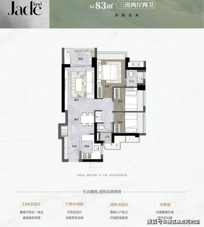 83㎡的3房2厅2卫,设计的是竖厅格局,进门入户玄关,LDKB一体化,S墙设计预留冰箱卡槽位,U型厨房,主卫少了淋浴,公卫三段式分离,得房率约90.33%(包含赠送),阳台西北朝向。