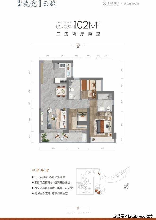 102㎡的3房2厅2卫,设计的是经典竖厅格局,进门入户玄关,客厅3.7米开间,LDKB一体化设计,动静分区,三开间朝南,客厅连接次卧出6.4米长的大阳台,U型厨房,卫生间干湿分离,得房率约75.41%(不含赠送),东南或西南朝向。