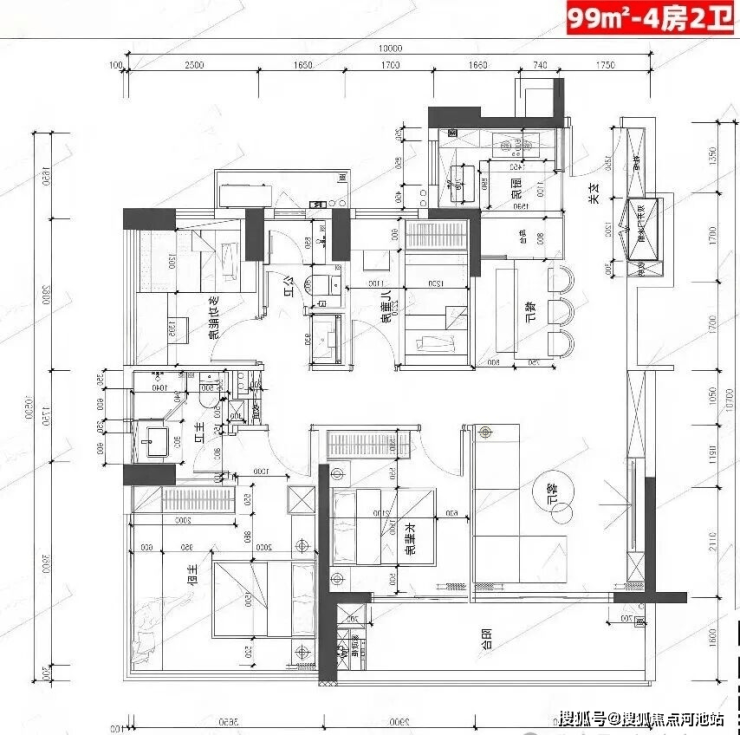 99㎡的4房2厅2卫,设计的是竖厅格局,客厅3.35米开间,LDKB一体化,S墙设计预留双开门冰箱卡槽位,三开间朝南,动静分区,U型厨房,公卫三段式干湿分离,赠送设备平台,得房率约78.27%(不含赠送),客厅连接次卧出9.37m²大阳台西南或东南朝向。靓点:99平做到了4房2卫,主卧270°无柱转角飘窗,厨房烟道外置+额外赠送设备平台,并且是纯南向格局。