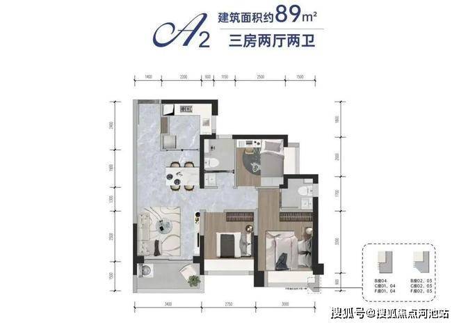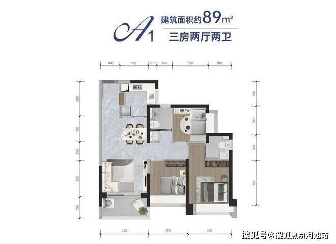 A1、A2户型,建筑面积:约89㎡户型设计:三房两厅两卫