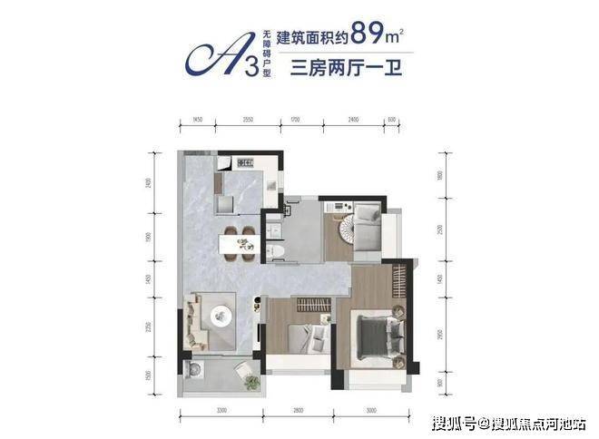 建筑面积:约89㎡,户型设计:三房两厅一卫