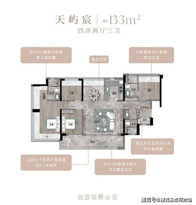 133㎡的4房2厅2卫,设计的是竖厅南北通透格局,进门入户玄关,客厅5.4米开间,餐客厅分离设计,客厅连接次卧出12.3m²的观景大阳台,L型中式+岛台灵动式厨房,公卫三段式干湿分离,得房率约78.27%(不含赠送),阳台主朝东南或西南向。靓点:超大客餐厅南北对流+8.2米长超大观景南向阳台,超大主卧+270°无柱转角飘窗