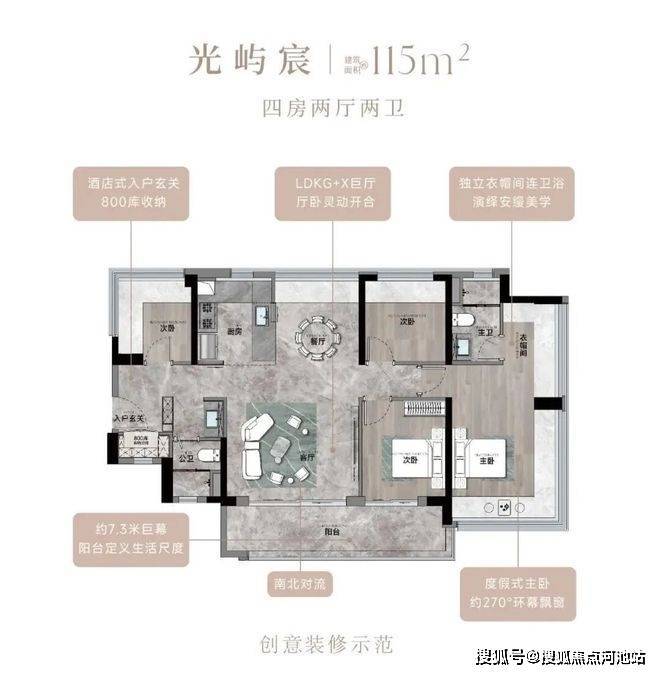 115㎡的4房2厅2卫,设计的是竖厅南北通透格局,进门入户玄关,客厅4.45米开间,餐客厅分离设计,客厅连接次卧出10.87m²的观景大阳台,L型中式+岛台灵动式厨房,公卫三段式干湿分离,得房率约78.27%(不含赠送),阳台主朝东南或西南向。靓点:南北对流+7.25米长超大观景南向阳台,超大主卧+270°无柱转角飘窗