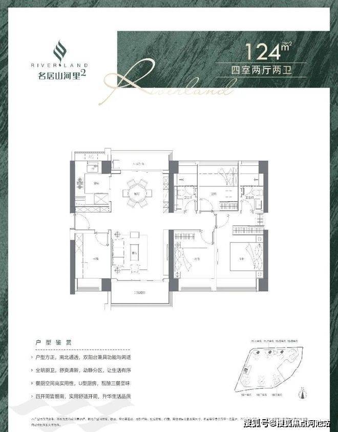 经典竖厅南北通格局,双阳台设计,其中,124㎡是142㎡的缩小版,餐客厅独立,客厅开间(124㎡为3.9m,142㎡为4.3m),U型厨房,卫生间干湿分离,四开间朝南,阳台1.5m进深,东南向