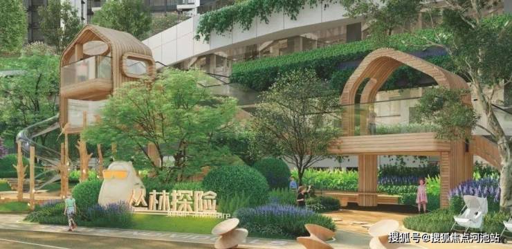设置瞭望塔、树屋、攀岩墙等分龄段游戏区,高绿量的户外亲子互动场地。