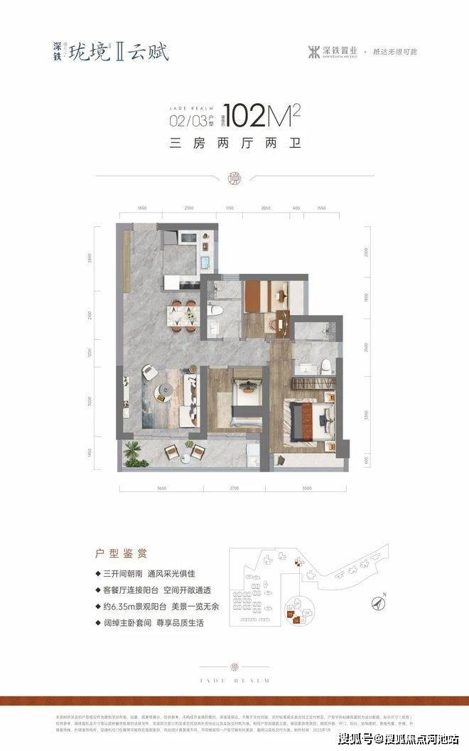 102㎡的3房2厅2卫,设计的是经典竖厅格局,进门入户玄关,客厅3.7米开间,LDKB一体化设计,动静分区,三开间朝南,客厅连接次卧出6.4米长的大阳台,U型厨房,卫生间干湿分离,得房率约75.41%(不含赠送),东南或西南朝向。