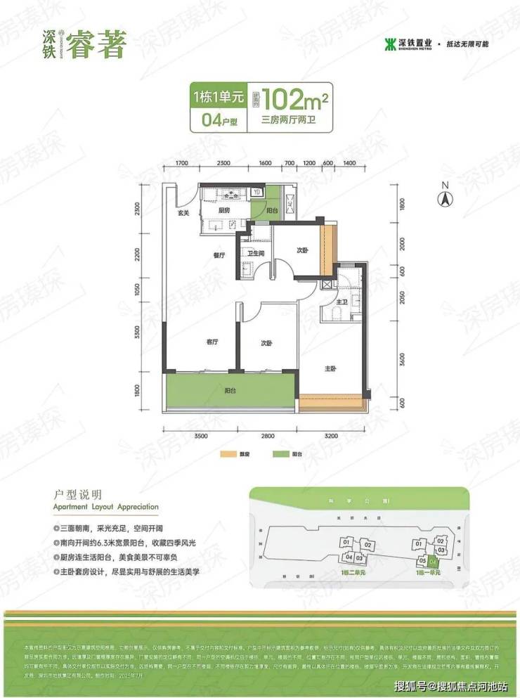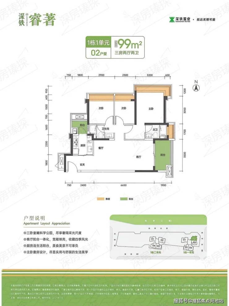 99㎡的3房2厅2卫,1栋1单元02户型,设计的是竖厅格局,客厅3.5米开间,LDKB一体化设计,进深11.7米,动静分区,三卧室朝东北向看科学公园,3个卧室分别做到了主卧18.06㎡/次卧9.57㎡/次卧7.59㎡(包含飘窗),二字型厨房还带1个生活阳台,公卫三段式分离,得房率约:80%(不含赠送),阳台6.55㎡东南朝向。套内面积79.2㎡+赠送面积12.58㎡=实用面积91.78㎡,加上赠送后得房率约92.7%。