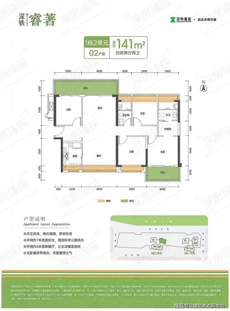 141㎡的4房2厅2卫,1栋2单元02户型,设计的是竖厅南北通透格局,进门入户玄关,客厅4米开间,实测高达31.58㎡方正餐客分离,餐厨一体设计,四开间朝南,主卧套房带阳台,4个卧室分别做到了主卧19.89㎡/次卧11.49㎡/次卧9.3㎡/次卧9.1㎡(实测面积,去掉墙体),客厅连接次卧出11.55㎡的巨幕大阳台,U型厨房,卫生间干湿分离,得房率约:80%(不含赠送),阳台主朝东北向看科学公园。套内面积112.8㎡+赠送面积18.5㎡=实用面积131.3㎡,加上赠送后得房率约93.12%。