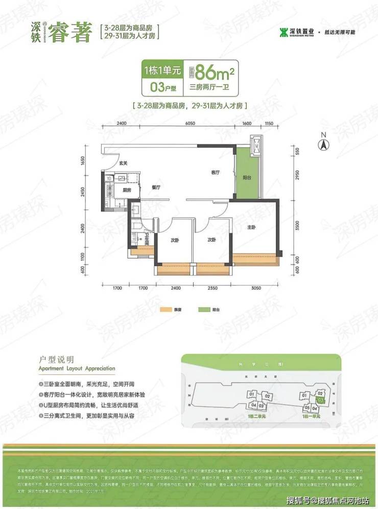 86㎡的3房2厅1卫,1栋1单元03户型,设计的是竖厅格局,客厅3.5米开间,LDKB一体化设计,进深10.05米,主卧全朝南,动静分区,3个卧室分别做到了主卧11.67㎡/次卧8.64㎡/次卧8.46㎡(包含飘窗),U型厨房,卫生间三段式分离,得房率约:80%(不含赠送),阳台5.5㎡东南朝向。套内面积68.8㎡+赠送面积8.5㎡=实用面积77.3㎡,加上赠送后得房率约89.88%。