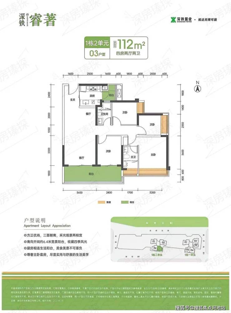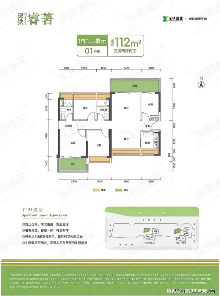 112㎡的4房2厅2卫,1栋1/2单元01户型,设计的是竖厅南北通透格局,进门入户玄关,客厅3.6米开间,实测高达23.88㎡餐客分离,餐厨一体设计,四开间朝南,主卧套房带阳台,4个卧室分别做到了主卧17.21㎡/次卧9.55㎡/次卧8.1㎡/次卧5.72㎡(实测面积,去掉墙体),客厅连接次卧出9.28㎡的巨幕大阳台,U型厨房,卫生间干湿分离,得房率约:80%(不含赠送),阳台主朝东北向看科学公园。套内面积89.6㎡+赠送面积16.1㎡=实用面积105.7㎡,加上赠送后得房率约94.37%。