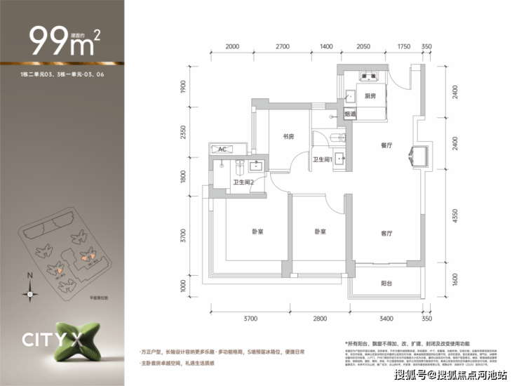 建筑面积约99㎡的3房2卫02/03/05/06户型:全南向爆款空间
