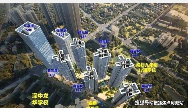 中交国润华府,由中交集团打造,总占地面积约3.72万㎡,总建筑面积约40万㎡,计容建筑面积约29.9万㎡,容积率8.0,分2个地块开发,共由7栋38-50层高住宅+1栋写字楼组成,其中商品房住宅38-48层,1栋保障房50F,1栋写字楼50F,规划有1所12班制幼儿园。注意楼层数暂定,还不是最终方案。