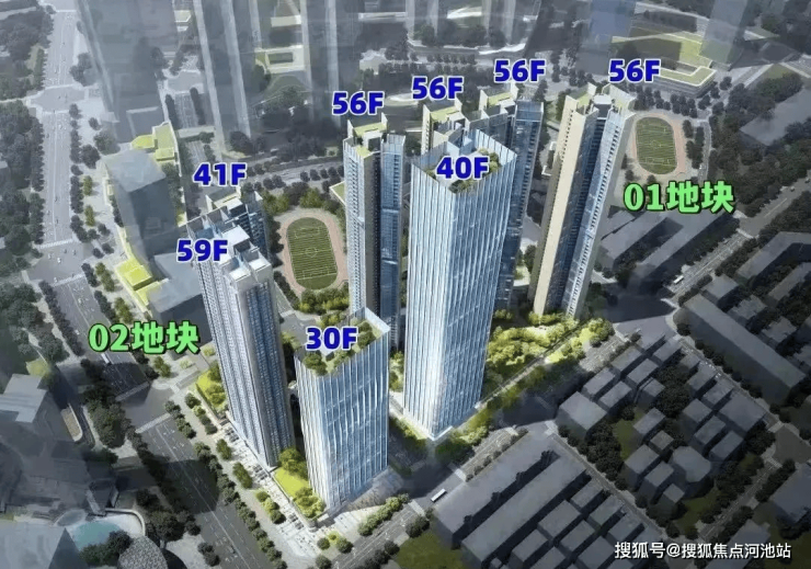 01-02地块,总占地面积约1.23万㎡,总建筑面积约15.08万㎡,计容建筑面积约10.85万㎡,容积率8.31,绿化率40.01%,共由2栋41-59F高的住宅组成,其中3栋住宅41F,4栋公共租赁住房59F,5栋办公楼30F,2栋是1所9班制幼儿园。