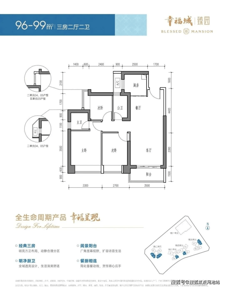 96-99㎡的3房2厅2卫,设计的是经典竖厅格局,客厅3.5米开间,LDKB一体化设计,动静分区,3个卧室分别做到了主卧14.63㎡/次卧11.07㎡/次卧7.26㎡(包含墙体飘窗),U型厨房,卫生间干湿分离,得房率约81-84%(包含赠送),东南/西南或东北朝向。