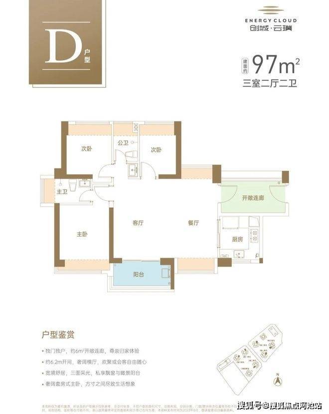 横厅南北通透格局,客餐厅6.2米开间,U型厨房,卫生间干湿分离,有额外赠送一大块入户花园,阳台主朝东南向。