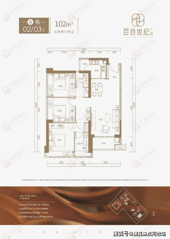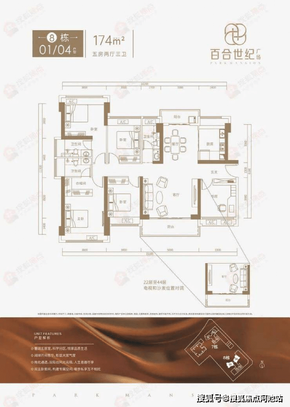 百合世纪广场开盘主推101㎡(7栋)、102㎡(8栋)、121㎡(7栋)、174㎡(8栋)户型。其中101-102㎡户型为传统竖厅布局,东南朝向,121-174㎡户型为客餐厅独立布局,带双阳台,南北通透。