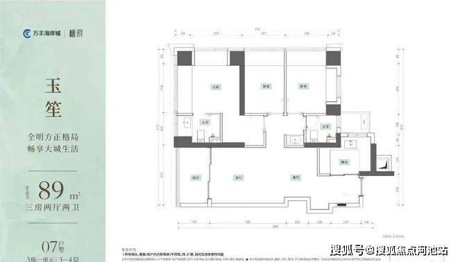89㎡的3房2厅2卫,设计的是竖厅格局,客厅3.375米开间,LDKB一体化,S墙设计预留冰箱卡槽位,三开间朝南,动静分区,U型厨房,公卫三段式干湿分离,得房率约95%(包含赠送),阳台5.9m²西南朝向。赠送面积约14.69m²。