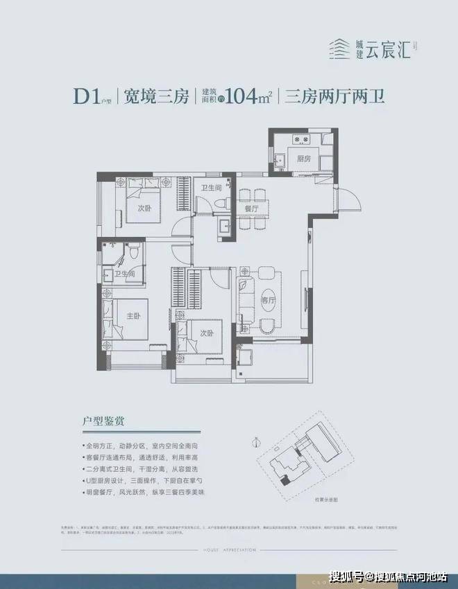 104㎡的3房2厅2卫,设计的竖厅南北通透格局,餐客厅一体化,U型厨房,阳台西南朝向。