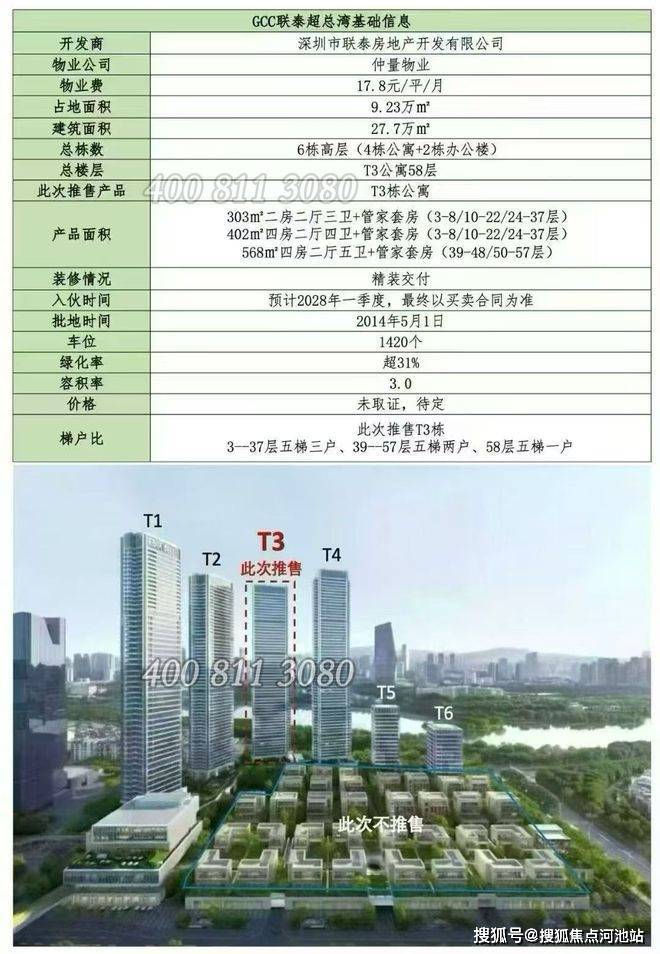 项目情况:首推T3栋约123套,层高3.6米,3-37层5梯3户,面积303-327-401平;39-57层5梯2户,面积401-570平;58层5梯1户,面积1000平。避难层9、23、38、49层。联泰超总湾售楼处电话4009099108