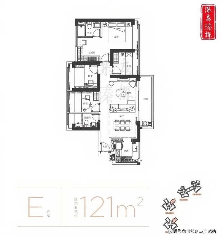 121㎡的4房2厅2卫,E户型,1栋1/2单元01户型,设计的是横厅南北通透格局,进门入户玄关,LDKB一体化设计,五开间朝南,主卧大套间设计,全屋6面飘窗,客餐厅出大阳台,U型厨房,卫生间干湿分离,得房率约75%(不含赠送),阳台主朝西南向。