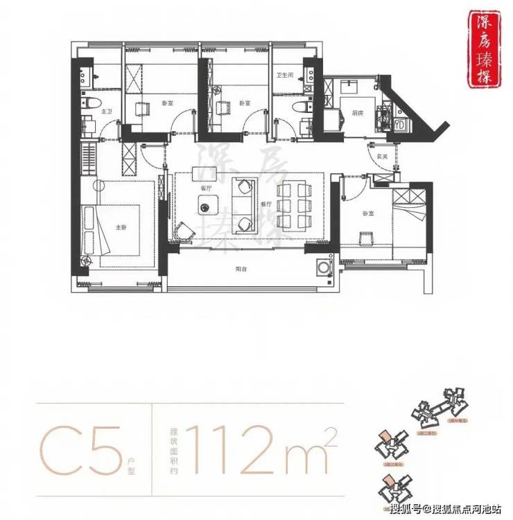 112㎡的4房2厅2卫,C5户型,1栋1/2单元02户型,设计的是横厅南北通透格局,进门入户玄关,LDKB一体化设计,四开间朝南,主卧大套间设计,全屋7面飘窗,客餐厅出大阳台,U型厨房,卫生间干湿分离,得房率约75%(不含赠送),阳台主朝西南向。