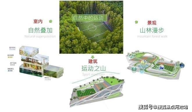 在建筑、室内、景观设计中分别融入了“运动之山”“自然叠加”“山林漫步”的设计思想,合理满足各种运动功能需求。