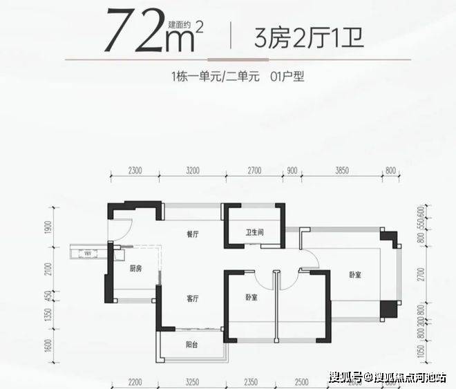 72㎡的3房2厅1卫,设计的是竖厅南北通透格局,进门独立玄关,LDKB一体化,主卧270°飘窗设计,L型厨房,卫生间干湿分离,得房率约100%(包含赠送),阳台主朝东北向。