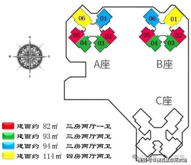 建面约82㎡的3房、约93/94㎡的3房、约114㎡的4房。特别注意,这个尺度比市面上同户型产品,要更加巧妙一点。
