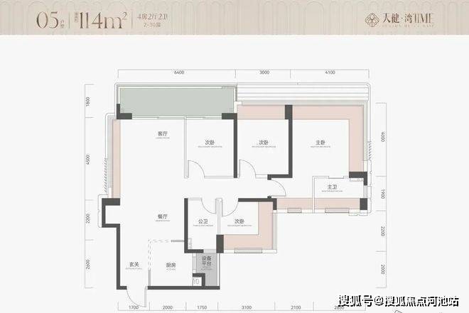 114㎡4房2卫,竖厅户型,朝北对着金众,户型结构和113完全一样,就是客厅也做了一面4.5米宽的凸窗;