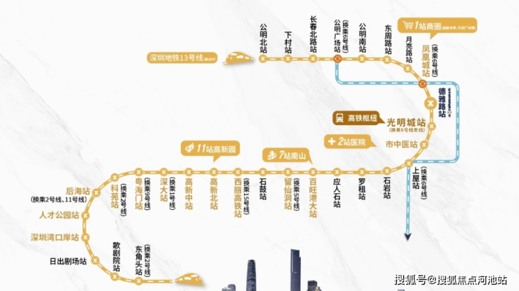 交通:项目门口即为地铁 13 号线德雅路站,预计今年年底开通运营,可 1 站换乘 6 号线或直达光明城高铁站,7 站即可抵达南山。