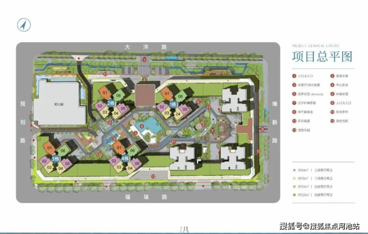 住宅户型:建面约84-128㎡三至四房,住宅使用率约78%