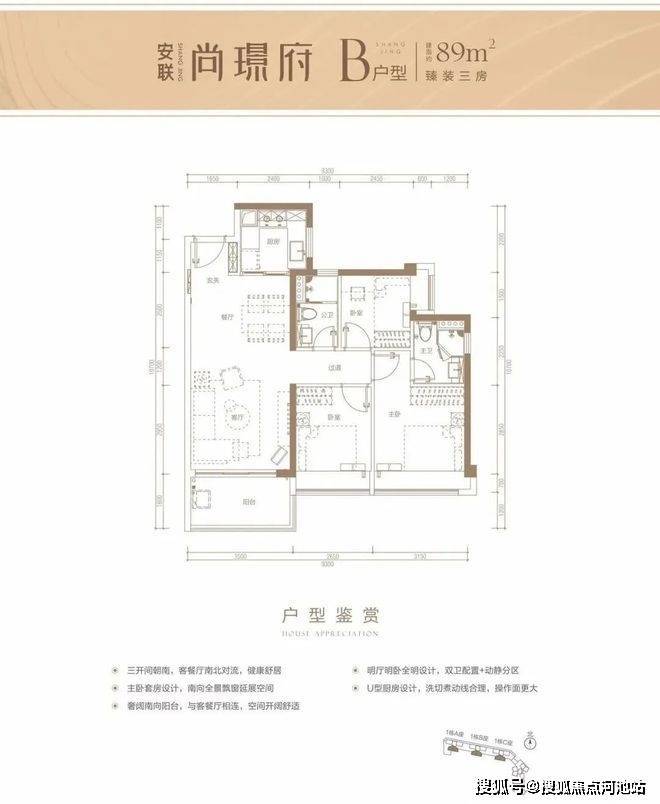 建筑面积约89㎡户型,动静分区布局,主要生活空间南向,全尺寸采光面日照、采光充足。客厅带有1.8米进深阳台,功能全面。主卧空间宽敞舒适,次卧空间紧凑实用。餐厨空间联系紧密,U型厨房自然通风采光,功能布局合理。