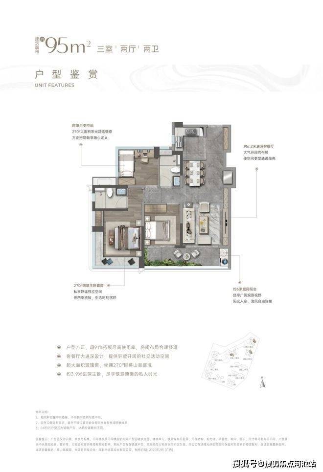 95㎡的3房2厅2卫,设计的是经典竖厅格局,客厅3.5米开间,LDKB一体化设计,主卧270°观景大飘窗,3个卧室分别做到了主卧15.24㎡/次卧7.68㎡/次卧7.55㎡(实测面积,去掉墙体),客厅连接次卧出6.3米长的大阳台,L型厨房,卫生间干湿分离,赠送面积超11.7㎡,得房率约95%(包含赠送),东北或西南朝向。