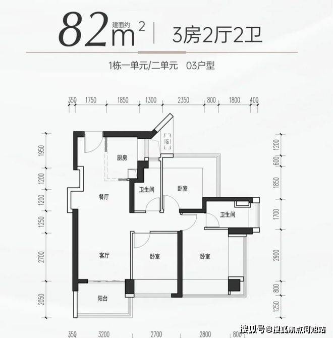 82㎡的3房2厅2卫,03户型,设计的是竖厅格局,进门独立玄关,LDKB一体化,S墙设计预留冰箱卡槽位,主卧双飘窗设计,L型厨房,卫生间干湿分离,得房率约100%(包含赠送),西南朝向。