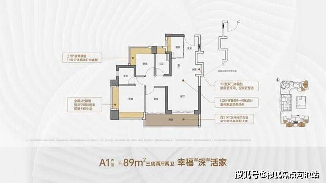 89㎡的3房2厅2卫,A1户型,设计的是竖厅格局,客厅3.5米开间,LDKB一体化,S墙设计预留冰箱卡槽位,客厅连接次卧出5.9米长的大阳台,主卧双面飘窗,次卧270度转角飘窗,U型厨房,卫生间干湿分离,阳台有朝西向、东向、南向。