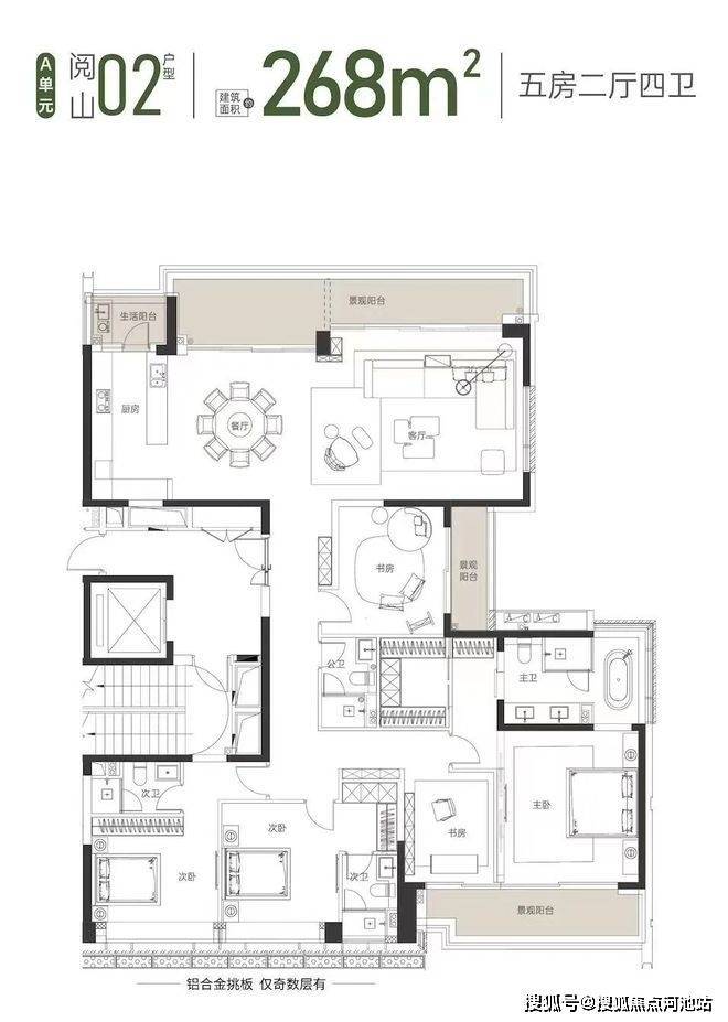 268㎡5房4卫,阅山楼王,两梯两户,专享私家电梯,南北四阳台、270°全景视野,约10.55米横厅,约16.1米南向大4房,总价2800万起!