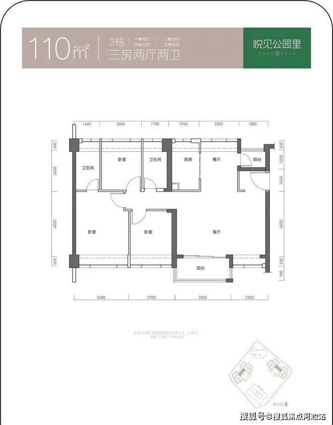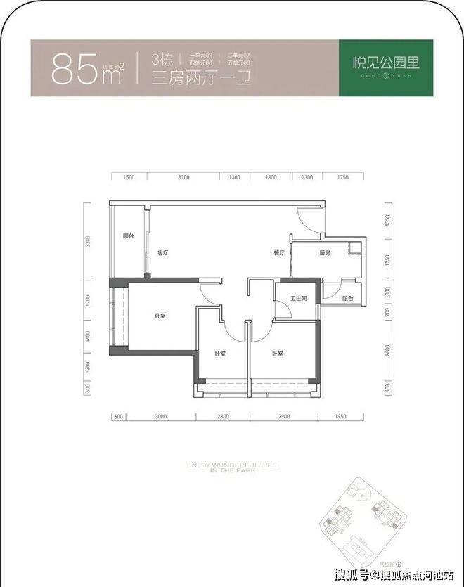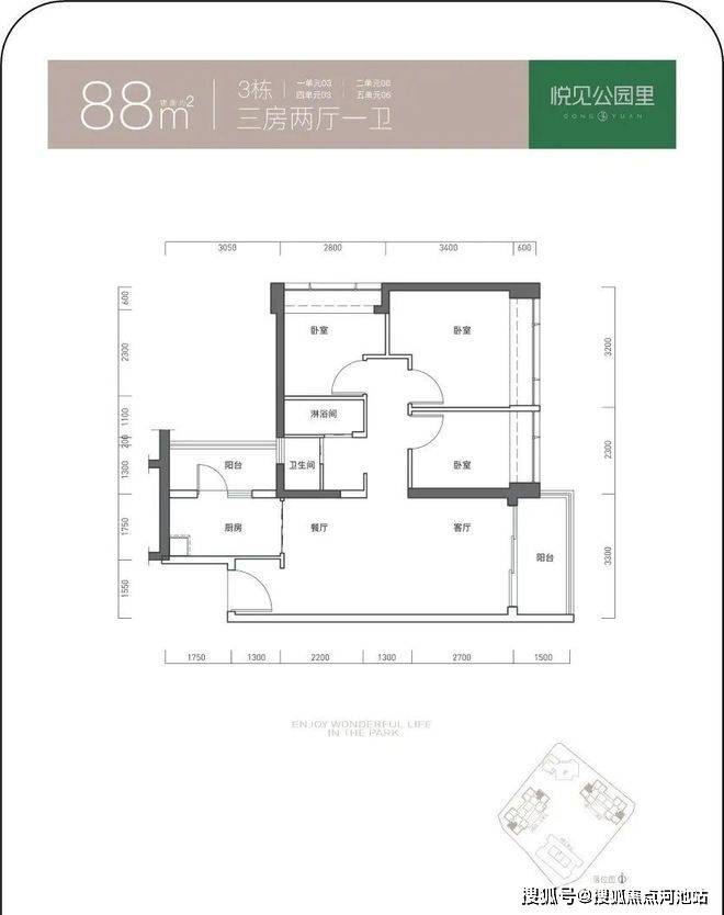 面积有85-88㎡的3房2厅1卫,91-94-95-97-110㎡的3房2厅2卫,120㎡的4房2厅2卫户型
