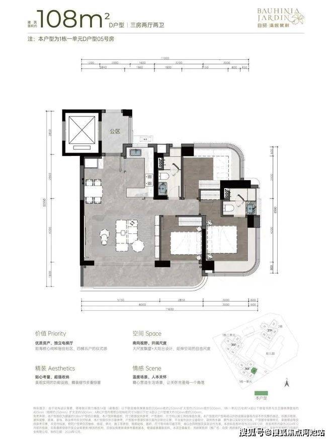 108-111㎡的3房2厅2卫,设计的是竖厅格局,客厅5.15米开间,超宽客厅,LDKB一体化设计,动静分区,三开间朝南,主卧大套间无柱弧形270°转角飘窗,客厅连接次卧出大阳台,U型厨房,卫生间干湿分离,得房率约92-100%(包含赠送),西南或东南朝向。