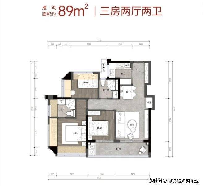 建筑面积约89㎡户型-3房2卫(竖厅)