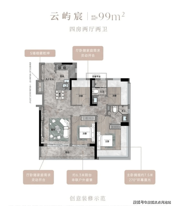 ✅ 99㎡4房2卫为项目主力户型,折后总价362-388万/套,单价3.63-3.89万/㎡,竖厅格局,LDKB一体化,三开间朝南,客厅连接次卧出9.37㎡大阳台,赠送设备平台,房源充足;