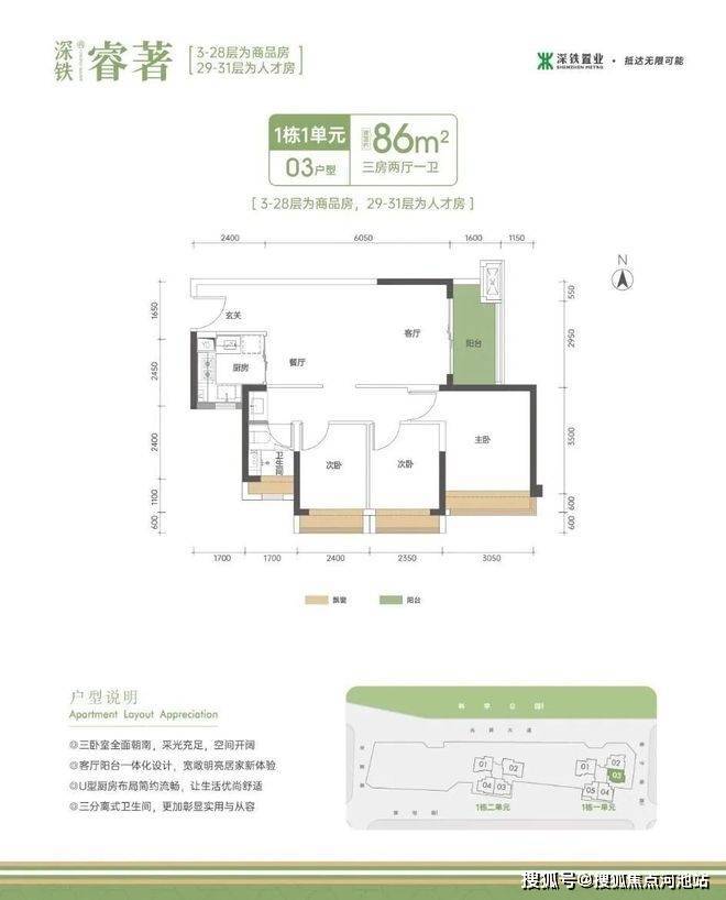 最新消息:光明中心区住宅新盘——深铁睿著广场已于2025年12月20日开盘选房。本次开盘共推出了228套商品房,1栋1、2单元,31层,2T4-5户,户型86-141㎡3-4房。备案均价4.3万带精装。同时取证的还有32套安居型商品房,88平29套,位于1栋1单元05户型;86平3套,位于1栋1单元03户型的29-31层,均价约2.5万,总价213万起,关于什么时候交楼?我们合同约定在2027年3月份带精装交房。